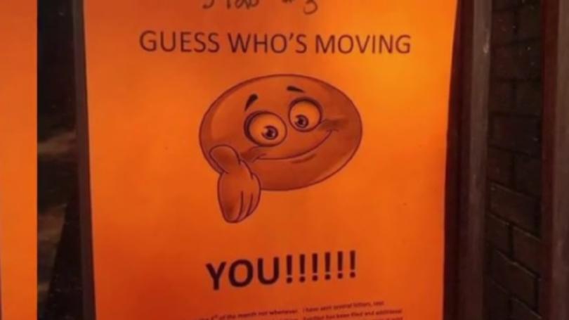 And it was taped to their door on a bright piece of orange paper that said, quote, "Guess who's moving? YOU!!!" along with big picture of a smiling emoji.
