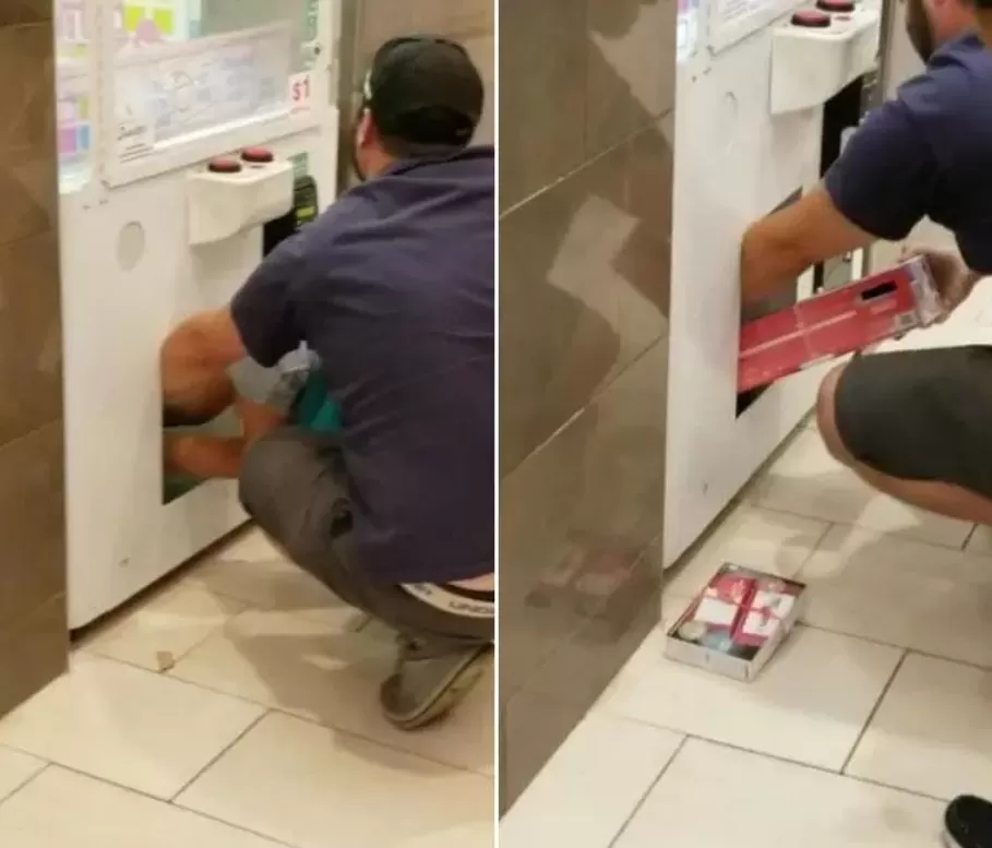 But because there are big prizes, there's also a big prize slot on the machine . . . so this guy had his young daughter crawl through the hole and pass him a bunch of the toys, electronics, and gift cards. Then they took off.